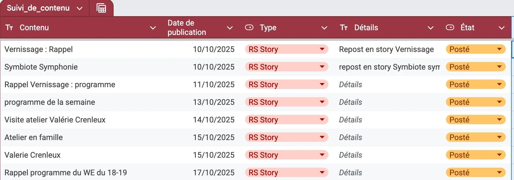 Je m’organise avec un fichier excel de ce type généralement et je vais les visuels de ce client dans Canvas car c’est son outil de préférence !